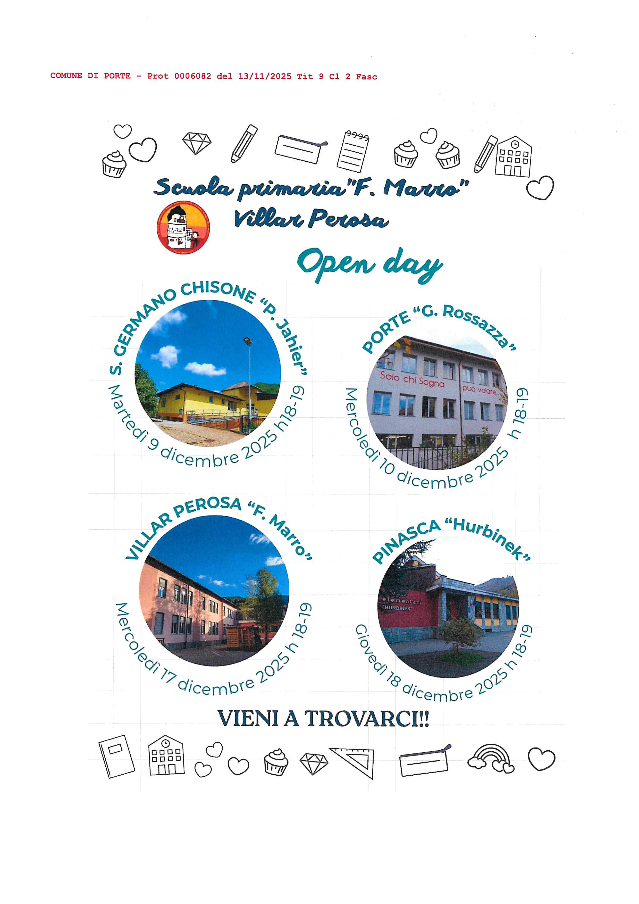 Presso la scuola dell'infanzia e la scuola primaria di Porte si terranno gli open day per permettere ai genitori dei futuri studenti di conoscere le nostre relatà.