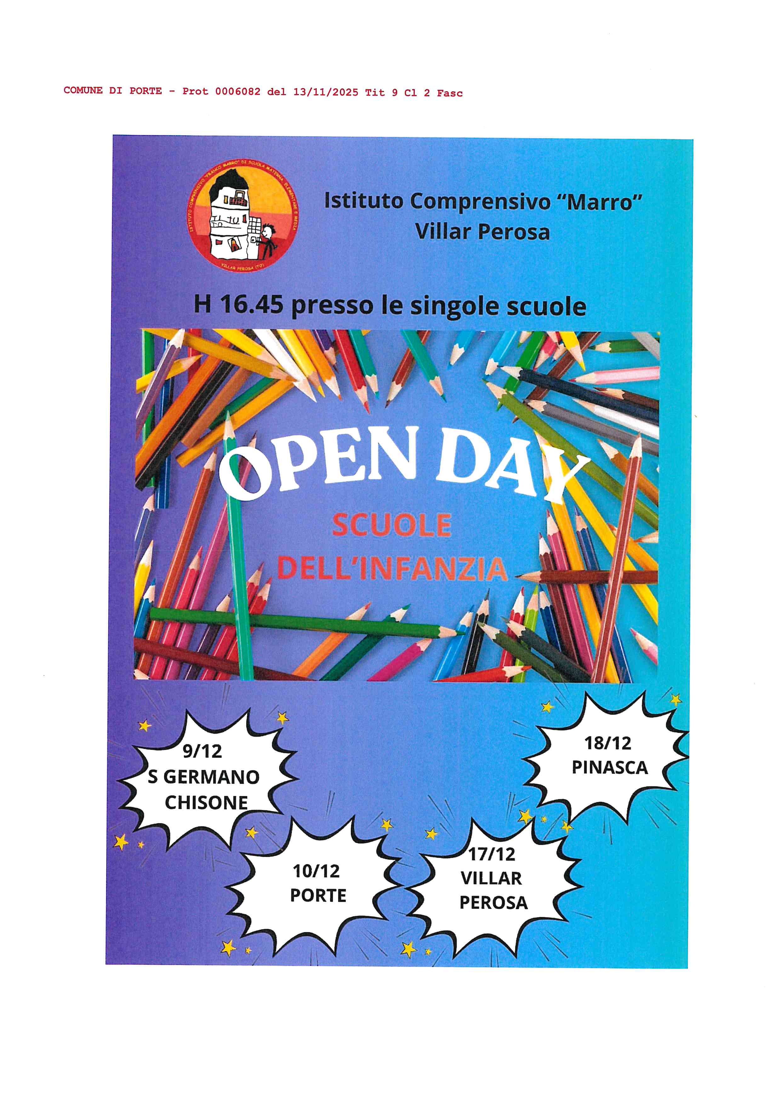 Presso la scuola dell'infanzia e la scuola primaria di Porte si terranno gli open day per permettere ai genitori dei futuri studenti di conoscere le nostre relatà.