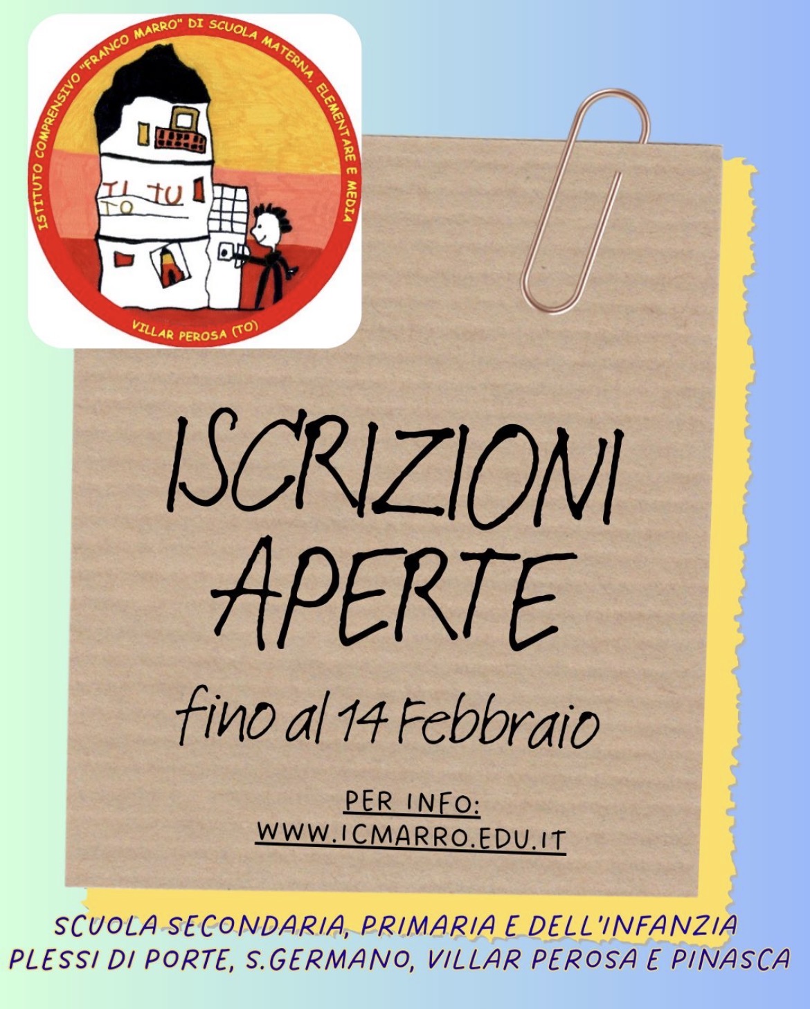 Si informano i genitori dei bambini nati nel 2023 che dal 13 Gennaio 2026 al 14 Febbraio 2026, sono aperte le iscrizioni alla scuola dell'Infanzia per l'anno scolastico 2026/2027.